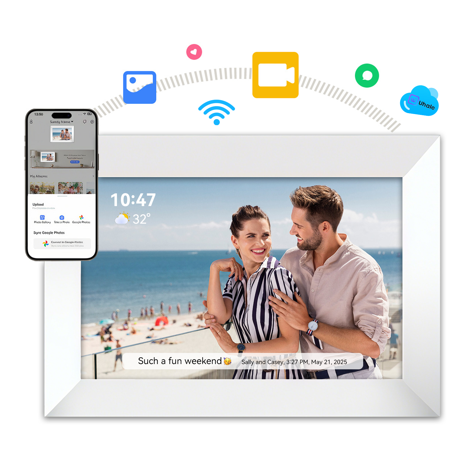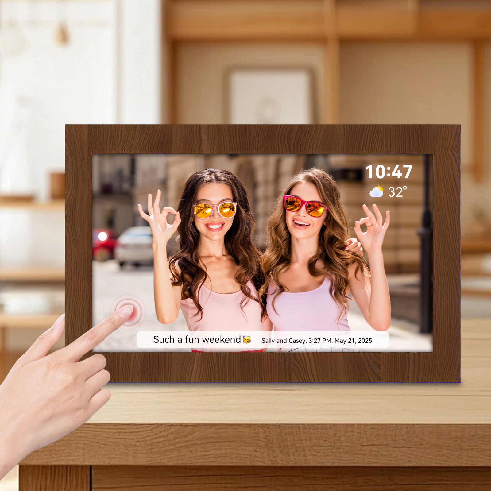 The Vassco smart photo frame is a smart hub for your home. It blends a clock, calendar, and real-time weather display with a vivid photo slideshow. With a simple tap, you can 'like' photos to share your love, turning every memory into an interactive, heartfelt moment.