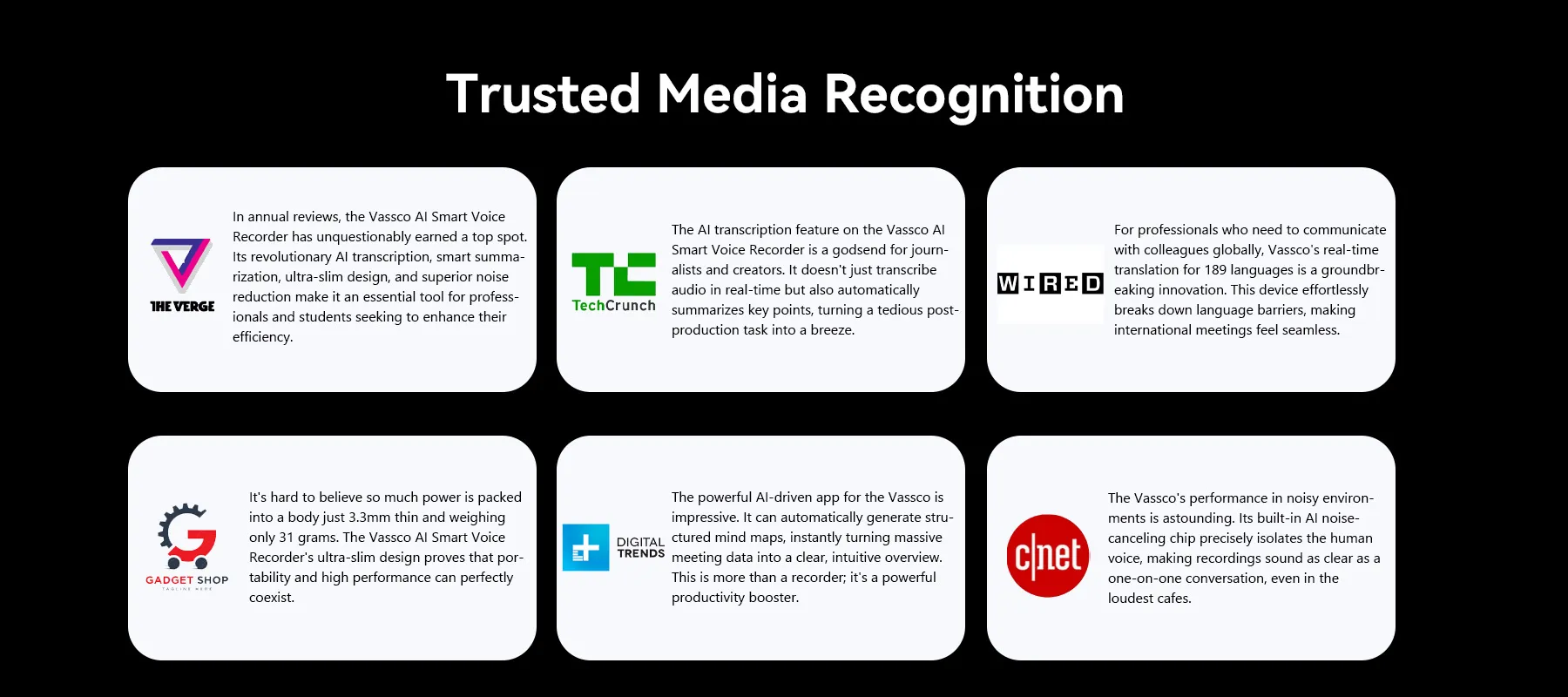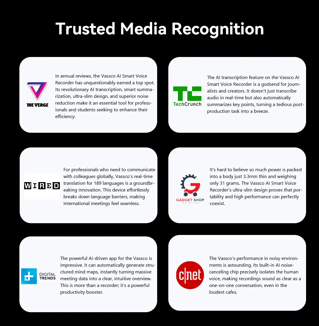 The Vassco AI Smart Voice Recorder was born. It features a powerful AI engine for real-time transcription and smart summarization, and its ultra-slim body includes built-in AI noise-cancellation technology, ensuring pristine audio quality. This is Vassco's core promise: to free your mind and let you focus on what truly matters.
